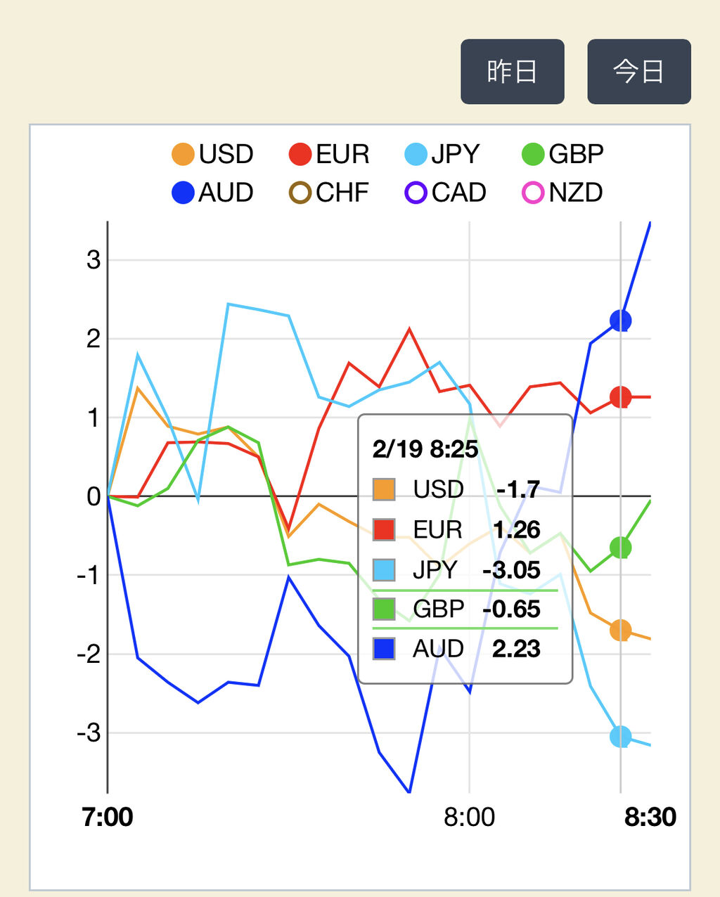 そして、『カレンシーストレングス』はその日の午前0時からの取引量を5分刻みで更新。